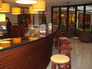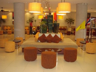 | 写真左は、ホテルの前にある、両替所。9:00−22:00オープンと、重宝しそうです。その並びには、 小さなコンビニもあるので、ちょっとしたスナックやドリンクはこちらでも調達できます。ホテルのミニバーは 水しか入っていなかったので。写真右はロビーの写真、ここに座ると、写真左と真ん中の景色が見えます。 |