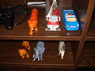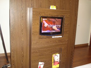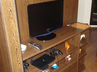 | 写真左上は、大人用ベッドルームに向いている、壁にはめ込んだテレビですが、この裏にまわると、 写真真ん中のようなプレステ2とおもちゃが置いてあるスペースになっています。椅子と電気もある ので、子供はここのスペースから動かない・・・。プレステのソフトは、ロビーで3枚まで借りることが できます。 |