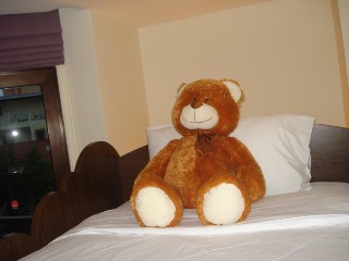 | 【ファミリールーム】 ダブルベッドと、子供用の二段ベッドが一部屋にあります。部屋の広さが、31SQMと聞いて、そうは 思えないぐらい、狭さを感じさせない、技ありのインテリアです。写真左上は、大人用ベッド、真ん中は 子供用二段ベッドですが、結構大きさもあり、150センチ以上の私でも寝ることができました。 くまちゃんもいました。 |