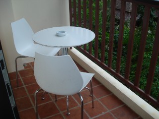 | 写真左、バスルームはちょっと狭いです。必要なものが、所狭しとならんでいるような感じですね。 バスタブは全室ありません。写真中央は、お部屋に備えつけの無料のコーヒー紅茶とポット。 写真右は、ベランダです。お部屋はプールに向かって建っているので、プールビューになります。 |