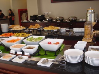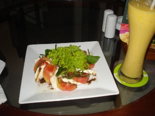 | 写真左は、ロビー横にあるインターネットコーナーです。写真真ん中はロビー横にある24/7という名前 のバー。ドリンクの他、サラダやパスタ、ピザ、サンドイッチなどのスナックメニューも充実。 写真左はそこで食べたトマトとモッツアレラのサラダ。ソファー席はプールに面しています。 |