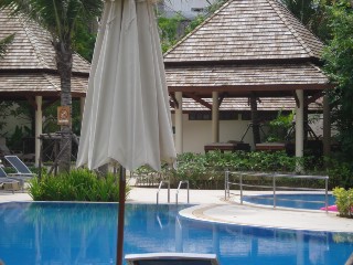 | プールはそれほど広くはないのですが、子供用のプールもあります。写真中央に見える、屋根つきの、 スペースは、マッサージベッドが並んでいます。ここでタイマッサージやオイルマッサージが受けられるそう ですが、目隠しがないので、水着をつけてのマッサージになりそうですね。写真右は、朝食ビュッフェ です。プールサイドの席と内側の席があります。朝食もおいしくてよかったです。 |