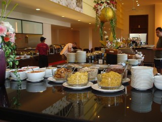 写真真ん中は、朝食レストラン。パンやシリアルの種類も多く
