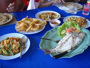 ★ ラチャ島一日観光レポ(2007年11月) ★ ![]() 朝8:00、ホテルにお迎えの車が来ました。 まず、約30分ぐらいかけてプーケット南部の シャロン湾へと向かいます。 8:45ごろ、シャロン湾へと到着。 ここで、船へと乗り換えます。 シャロン湾へ到着したら、ツアー会社のステッカーをもらい、このステッカーがツアー参加者の 目印になります。ここからは英語が堪能なガイドさんがラチャ島へと案内してくれるので、 ガイドさんの指示に従ってついて行きます。 9:00頃、スピードボートに乗り込み、ラチャ島へと出発です。 このスピードボート、スピードボートと言うだけあって、結構スピードが出ます。速いです。 そして、揺れます。風も強い風が吹き込みます。 この風が結構気持ちよくて、揺れもジェットコースターに乗ってるようで初めは楽しんでました。 船に強くない私でも、『これなら酔わないかも〜♪』なんて思っていたら・・・ ラチャ島へはボートで約30分かけて行きます。 なので、激しい揺れも30分続きます。。。 最後10分くらいで、少し「うっ・・・」と気分が悪くなりました。船酔いに弱い人はしっかり酔い止め を飲んでおきましょう。。。(もしかするとラチャ島沖は、波が高いのかもしれません、 前回も同じところで酔いました) 9:30、ラチャ島のパトックビーチに到着です。 プラスチックで出来た桟橋を渡ってビーチへ降りるのですが、桟橋から、ふと下を見ると、 海の水が透明で底が見えます! 透明なエメラルドグリーンの海です。 このクリアグリーンを見たら、少し船酔いをして悪くなった 気分も、すぅーっとスッキリ晴れてしまいました! そして、前方のビーチを見るとまぶしいぐらいのホワイトサンドです。透明感は抜群! そうそう、このプラスチックの桟橋、波が来ると桟橋も波を打ちますので、海に気を取られすぎて、 落ちないように気をつけてください。 ビーチに降りたら、ガイドさんの説明を受けて、シュノーケリングツアーへ行く集合時間まで 約1時間半、自由時間です。 ビーチチェアーは2つだと1日150バーツ、1つだと80バーツです。 海を背にして左のほうに、後で食事をとるレストランがあります。このレストランにトイレとシャ ワーがあります。 トイレは通常10バーツですが、ツアーステッカーをしていれば無料で 使えます。シャワーも水シャワーがトイレのすぐ近くにあります。 ちなみに、ホテル『Tha Racha』のキレイな公衆トイレもビーチの右の方にあったのですが、 こちらはトイレ10バーツ、シャワー20バーツで有料だそうです。。。 11:00、再び集合してボートに乗り込み、シュノーケリングポイントへ行きます。 この会社のツアーでは、シュノーケリングマスクとライフジャケットは貸出をしてくれるのです が、フィンはないので、希望者はパトックビーチにある、レンタル所にて80バーツで借ります。 ボートで少し行くと、初めのシュノーケリングポイントのサイアムベイに到着です。 ここでライフジャケットとシュノーケルマスクを装着し、約25分間自由に泳ぎます。 ツアースタッフがパンを海に投げ込むと、キレイな魚たちがうじゃうじゃ寄ってきました! 少し顔を水につけるだけで、魚がたくさん見られます。 ガイドさんの集合の声でボートに戻ります。 ボートに戻るとフルーツ(スイカとパイン)とお水、 ペプシが用意されていました。ボート内でちょっと一息ついていたら、次のポイントの コンケーベイに到着です。 ここは、ダイビングのライセンスを取るのに、利用されているらしく、この日も少し離れた ところでダイビングしているグループがいました。 ここでも、約25分間シュノーケルタイムです。 ここはダイビングでも使われているだけあって、魚の種類も豊富でした! さっきのポイントでいなかったお魚たちがたくさんいました。 黄色い魚、赤い魚、青い魚、白と黒のシマシマの魚、長細い魚。。。ほんとにたくさんいました。 1回目のポイントでは、疲れて15分くらいで上がってしまってたのですが、こちらでは夢中で 25分間泳ぎ回りました。 シュノーケルタイムが終わったら、再び船に乗り、島をぐるりと周りながら、はじめの ポトックベイに戻ります。 12:30、ちょうどいい具合のランチタイムです。 ビーチ左側のレストランで、みんなでランチを食べます。この日のメニューは チャーハン、野菜炒め、イカの甘酢炒め、鶏肉とカシューナッツの炒め、蒸し魚、 エビとオニオンのフリッターでした。 6人ぐらいが同じテーブルで取り分けながら食べるスタイルです。最後にフルーツ (スイカ・パイン・バナナ)とホットコーヒーまたは紅茶が出ました。 ![]() 満腹になった後は、船が出る15:15分まで約2時間、再び自由行動です。 レストランの上のほうにビューポイントがあるので、そちらで記念撮影したり、泳いだり、 ビーチを散策したり、チェアーに座って本を読んだり・・・。みんなそれぞれ自由に くつろいでいました。 私は、シュノーケルで泳ぎ