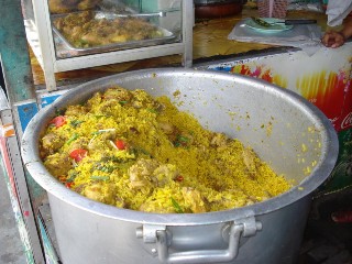 店頭の大きな鍋の蓋を取ると、おいしそうなごはんとチキンがいっぱい〜!